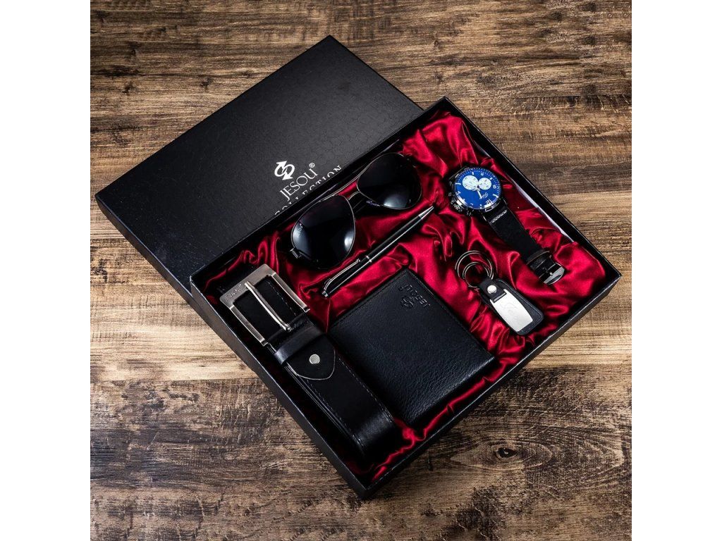 Sada obsahuje: Hodinky, peňaženku, slnečné okuliare, opasok, pero, kľúčenku.